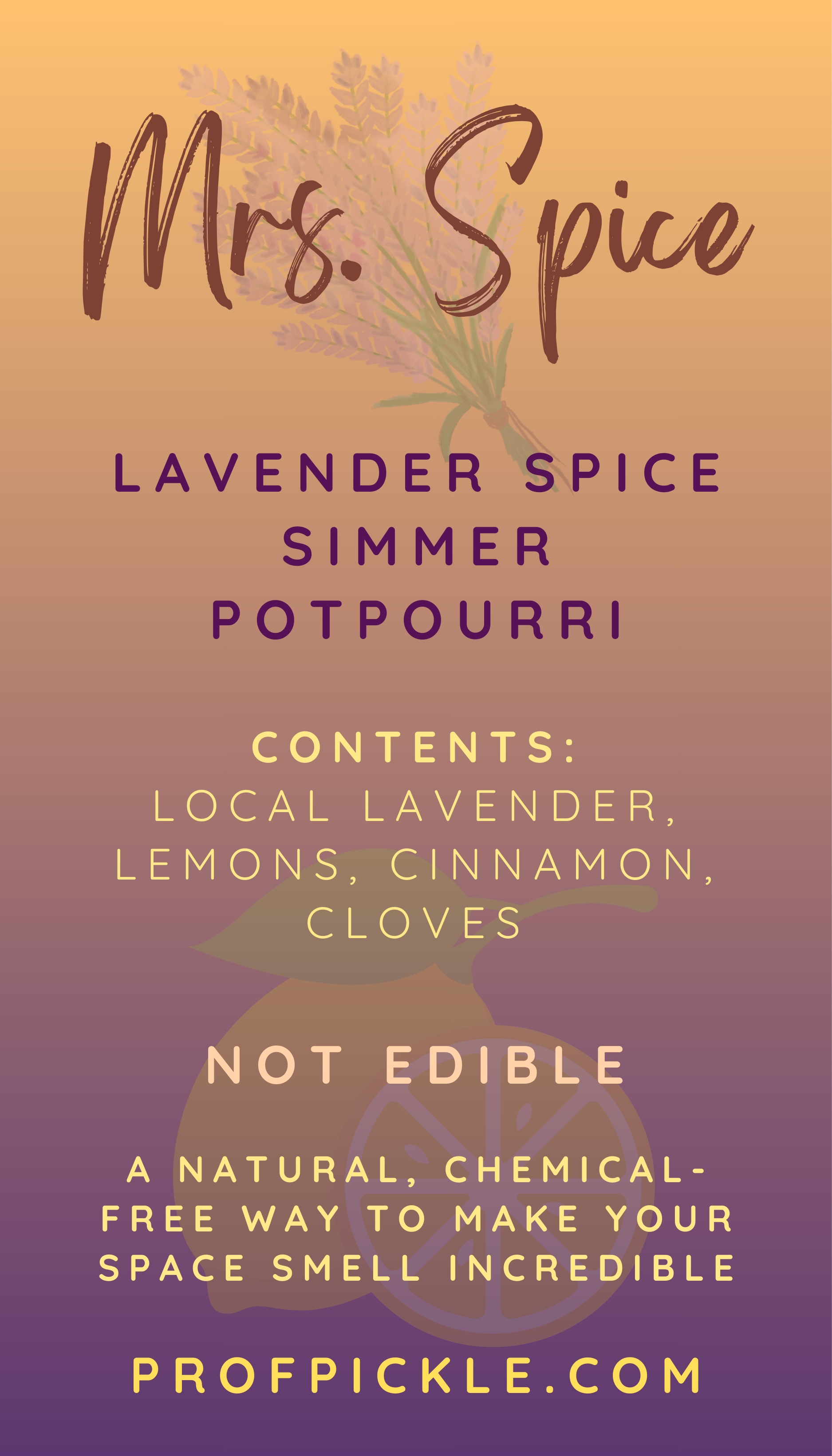 Our lavender spice pot is a soothing and refreshing blend designed to calm the senses and uplift your space. This fragrant mix combines locally-sourced lavender stems with the bright, zesty aroma of lemons, complemented by the warmth of cinnamon sticks and cloves. As it simmers, it releases a harmonious balance of floral, citrus, and spice, creating a peaceful, welcoming atmosphere in any room. Perfect for unwinding after a long day or adding a touch of tranquility to your home, this natural potpourri offers a simple, all-natural way to enjoy the calming scent of lavender with a refreshing twist. Just add water and let the soothing fragrance fill your home.